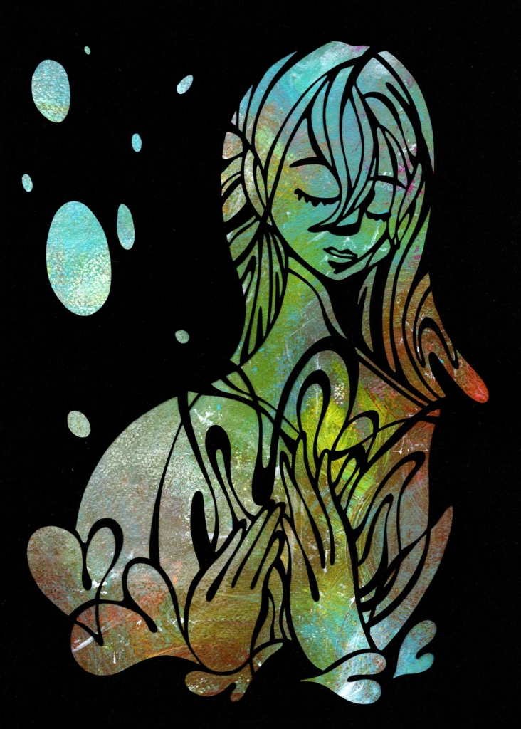 朝目覚めてすぐ、この絵のイメージが浮かび、一気に完成させた切り絵です。