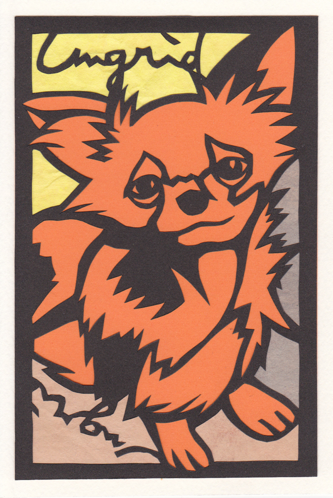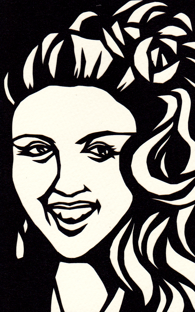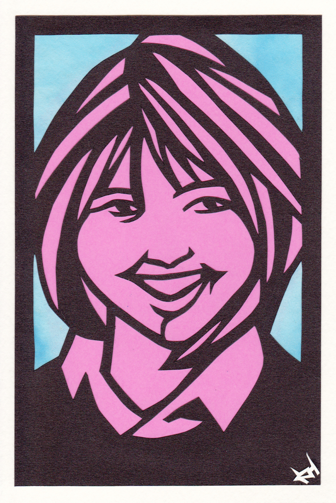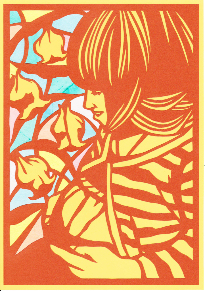 人物を抽象的に捉えた切り絵作品。最小限の色を使い、人物の存在感を表現します。あまりリアルに描いてほしくない人におすすめです。