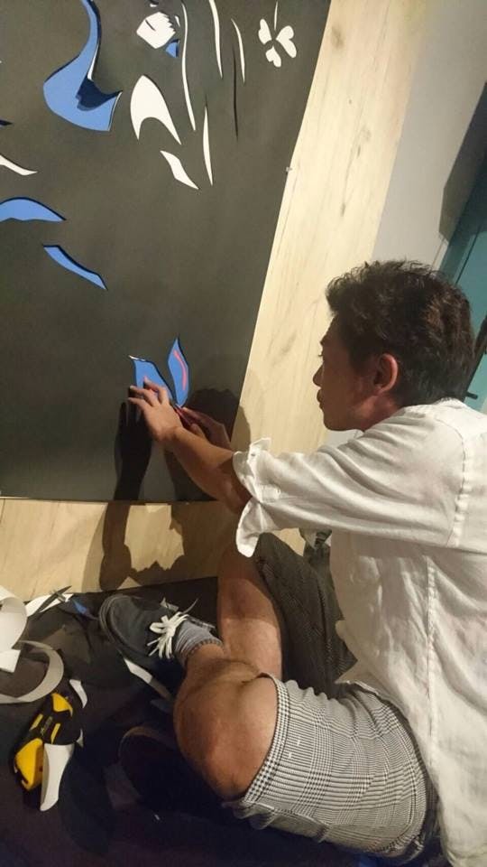 大きな黒いキャンバスをカッターナイフで切り抜いて作品制作を行う、切り絵のライブパフォーマンスも行う。